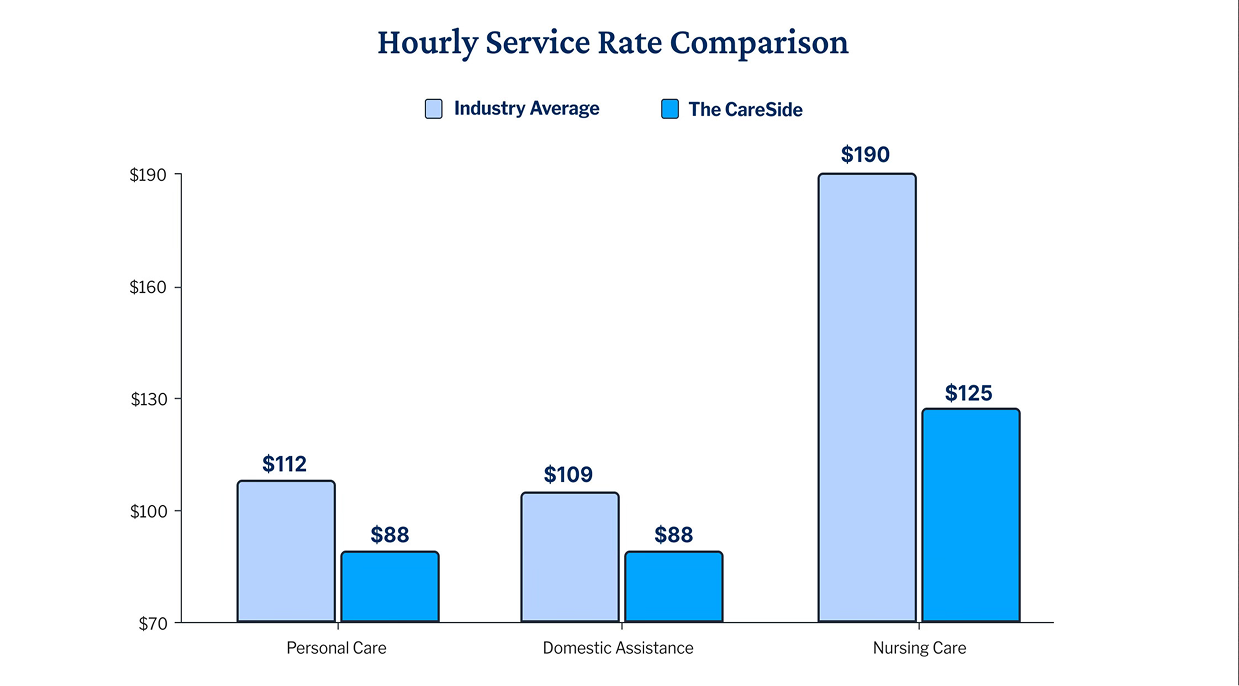 On average, The CareSide is 25% less expensive than other home care providers. That directly translates into more hours of support for you. We will never surprise you with locked-in contracts or hidden fees—just honest pricing and premium care at an exceptional value.